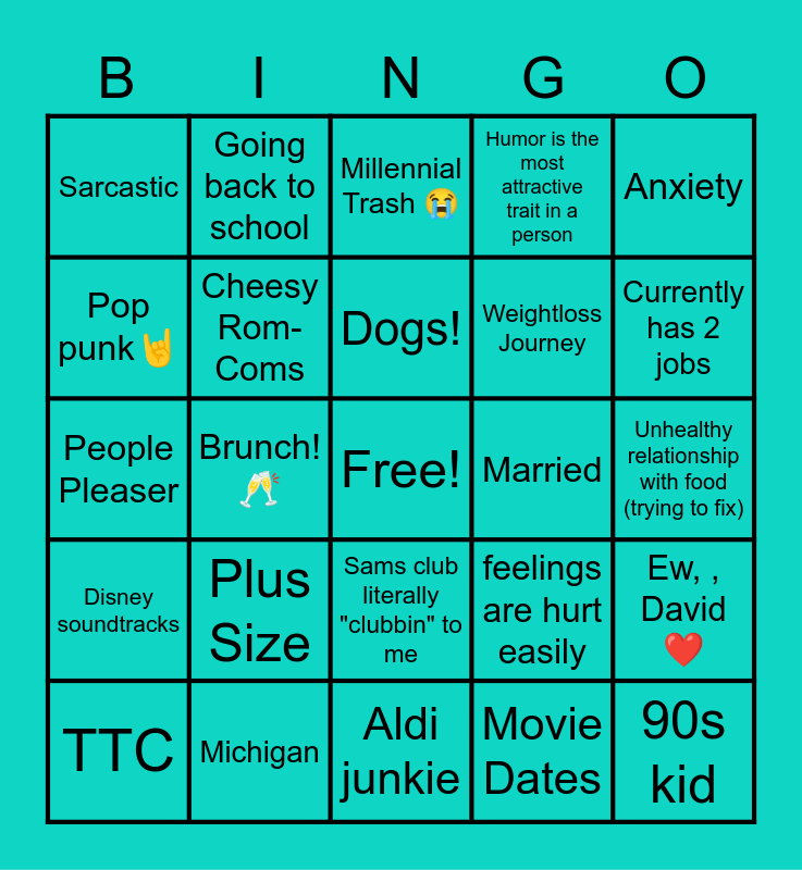 This bingo card has a free space and 24 words: Plus Size, Michigan, Dogs!, TTC, Anxiety, Sarcastic, Pop punkš¤, Going back to school, Married, Sams club literally "clubbin" to me, Weightloss Journey, People Pleaser, feelings are hurt easily, Ew, , Davidā¤ļø, Cheesy Rom-Coms, Movie Dates, Unhealthy relationship with food (trying to fix), Millennial Trash š, Currently has 2 jobs, Brunch! š„, 90s kid, Disney soundtracks, Humor is the most attractive trait in a person and Aldi junkie.