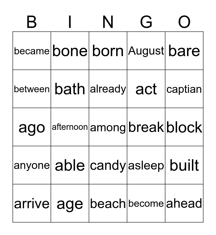 This bingo card has a free space and 24 words: able, age, already, arrive, bare, became, between, bone, break, candy, act, ago, asleep, built, bath, become, block, born, captian, afternoon, ahead, anyone, August and beach.