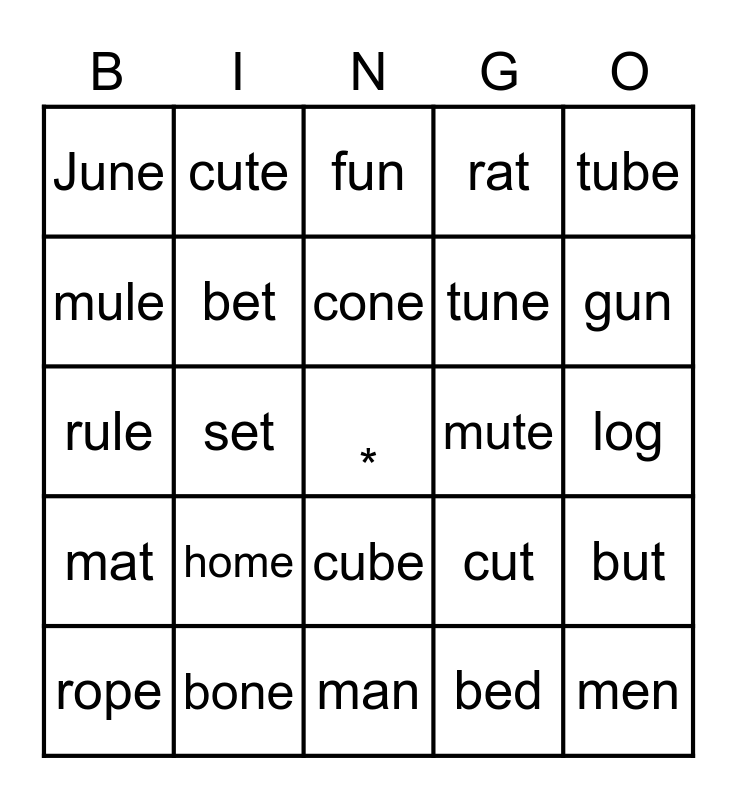This bingo card has a free space and 24 words: home, bone, cone, rope, tube, June, mule, cute, mute, cube, tune, rule, cut, but, bet, bed, log, fun, gun, set, men, mat, rat and man.
