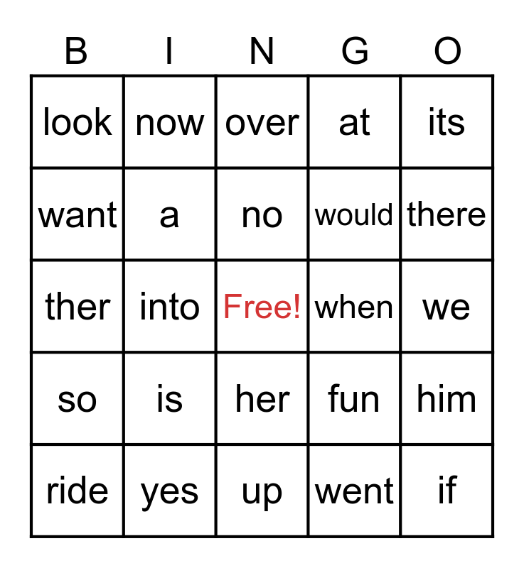 This bingo card has a free space and 24 words: is, yes, no, ride, its, look, want, now, when, her, would, ther, fun, him, a, went, we, over, there, into, if, so, at and up.