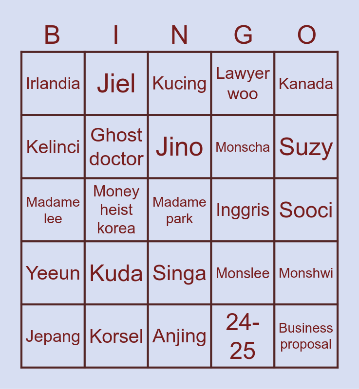 This bingo card has a free space and 24 words: Kuda, Korsel, Jino, Jepang, Kanada, Irlandia, Kelinci, Jiel, Inggris, Singa, Monscha, Madame lee, Monslee, Monshwi, Ghost doctor, 24-25, Sooci, Kucing, Suzy, Money heist korea, Business proposal, Yeeun, Lawyer woo and Anjing.