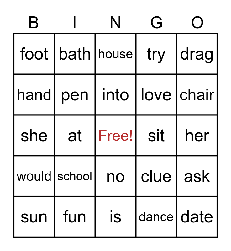 This bingo card has a free space and 24 words: school, fun, into, sun, drag, foot, hand, bath, sit, no, love, she, clue, ask, pen, dance, her, house, chair, at, date, would, try and is.