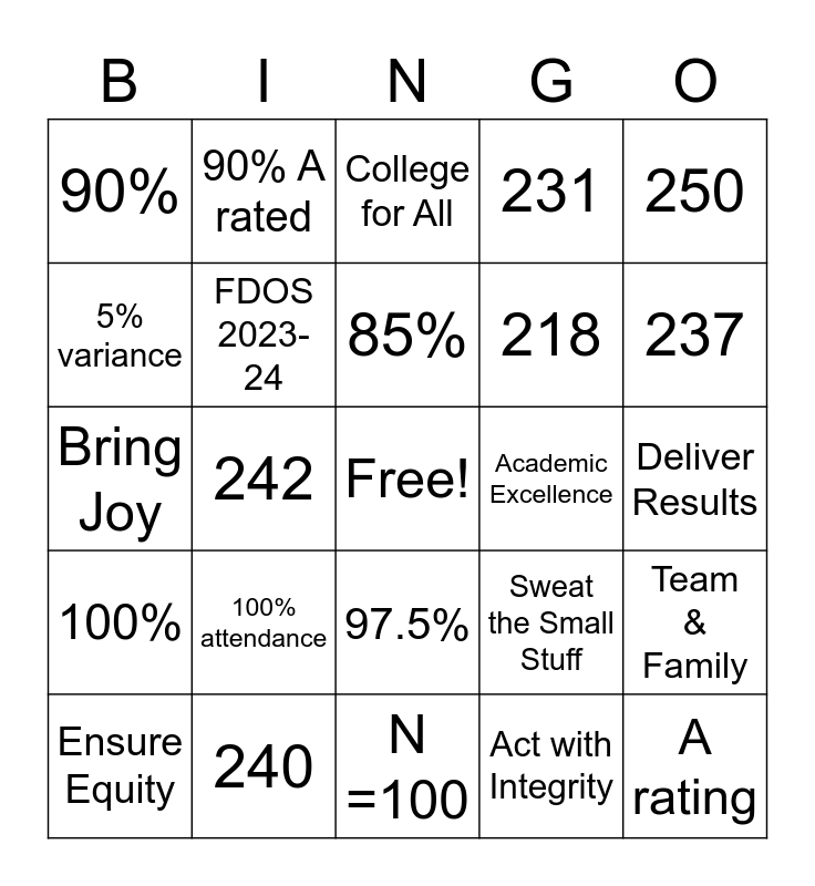 This bingo card has a free space and 24 words: 100% attendance, 240, 85%, Ensure Equity, 250, 90%, 5% variance, 90% A rated, Academic Excellence, 97.5%, 218, Bring Joy, Sweat the Small Stuff, Team & Family, FDOS 2023-24, Act with Integrity, Deliver Results, College for All, 237, 242, A rating, 100%, 231 and N =100.