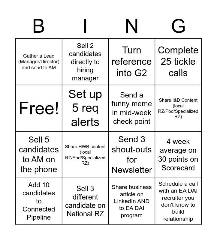 This bingo card has 16 words: Sell 3 different candidate on National RZ, 4 week average on 30 points on Scorecard, Turn reference into G2, Gather a Lead (Manager/Director) and send to AM, Sell 5 candidates to AM on the phone, Sell 2 candidates directly to hiring manager, Send 3 shout-outs for Newsletter, Share business article on LinkedIn AND to EA DAI program, Free!, Set up 5 req alerts, Add 10 candidates to Connected Pipeline, Complete 25 tickle calls, Share HWB content (local RZ/Pod/Specialized RZ), Share I&D Content (local RZ/Pod/Specialized RZ), Send a funny meme in mid-week check point and Schedule a call with an EA DAI recruiter you don't know to build relationship.