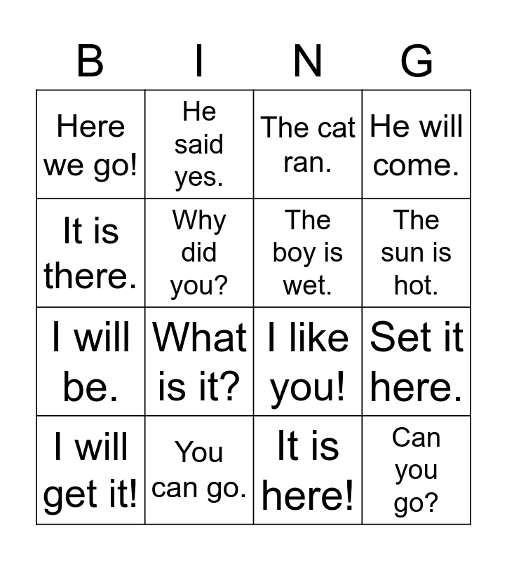 This bingo card has 16 words: You can go., Set it here., The cat ran., Here we go!, I will be., He said yes., I like you!, It is here!, It is there., Why did you?, I will get it!, He will come., What is it?, The sun is hot., The boy is wet. and Can you go?.