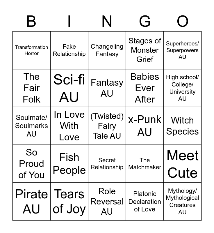 This bingo card has 80 words: Our Goblins Are Different, Demon Slaying, Changeling Fantasy, I See Dead People, Missing Reflection, Occult Detective, Council of Vampires, Wolf Man, Evil Tainted the Place, Will-o'-the-Wisp, Horror Hunger, Van Helsing Hate Crimes, Stages of Monster Grief, Transformation Horror, Came Back Wrong, The Fair Folk, House Fey, Fish People, Land of Faerie, Witch Species, Alpha/ Beta/ Omega AU, Superheroes/ Superpowers AU, Soulmate/ Soulmarks AU, Fantasy AU, Sci-fi AU, Cowboy/ Western AU, Fandom-specific AU, Fusion Crossover AU, Historical AU, Time Travel AU, High school/ College/ University AU, Apocalypse AU, Role Reversal AU, Mythology/ Mythological Creatures AU, Pirate AU, x-Punk AU, Childhood Friends AU, Mafia/ Organised Crime AU, Alternate Employment AU, (Twisted) Fairy Tale AU, Arranged Marriage, Green-Eyed Epiphany, Childhood Friend Romance, Rejected Marriage Proposal, Lovable Rogue, Fake Relationship, Star-Crossed Lovers, Battle Couple, Unresolved Sexual Tension, Bodyguard Crush, Meet Cute, In Love With Love, The Matchmaker, Rescue Romance, There Is Only One Bed, First Kiss, Love Confession, Romantic Rain, Undercover as Lovers, Secret Relationship, Babies Ever After, Cheery Pink, Comfort Food, Everybody Lives, Happily Adopted, Home Sweet Home, Happy Dance, Pet the Dog, Pursue the Dream Job, Happily Married, So Proud of You, Tears of Joy, You Are Not Alone, Family of Choice, Bear Hug, Friendship Trinket, Platonic Declaration of Love, Vitriolic Best Buds, The Power of Family and Hot Drink Cure.