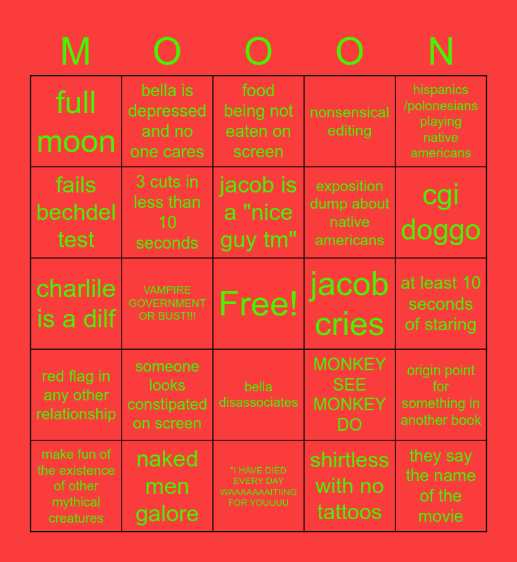 This bingo card has a free space and 24 words: someone looks constipated on screen, naked men galore, jacob is a "nice guy tm", make fun of the existence of other mythical creatures, hispanics /polonesians playing native americans, full moon, fails bechdel test, bella is depressed and no one cares, jacob cries, bella disassociates, exposition dump about native americans, charlile is a dilf, MONKEY SEE MONKEY DO, origin point for something in another book, 3 cuts in less than 10 seconds, shirtless with no tattoos, at least 10 seconds of staring, food being not eaten on screen, cgi doggo, VAMPIRE GOVERNMENT OR BUST!!!, they say the name of the movie, red flag in any other relationship, nonsensical editing and "I HAVE DIED EVERY DAY WAAAAAAAITIING FOR YOUUUU.