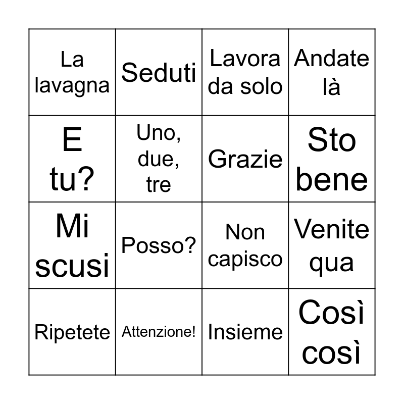 This bingo card has 39 words: Buongiorno, Arrivederci, Per favore, Grazie, Prego, Come stai?, Sto bene, Sto male, E tu?, Così così, Venite qua, Andate là, Ripetete, Insieme, Attenzione!, Guardate, Ascoltate, La lavagna, Occhi a me, Occhi a te, Uno, due, tre, Quattro, cinque, sei, Mi scusi, Posso?, Andare, Al bagno, Bere, Tutti, In piedi, Seduti, Pronti?, Cominciamo, Lavora da solo, Lavorate in gruppi, Lavorate con un compagno, Molto bene, Capisco, Non capisco and Capisci?.