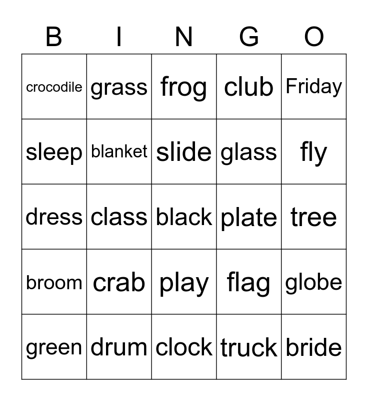 This bingo card has a free space and 24 words: crab, drum, slide, green, Friday, crocodile, sleep, grass, plate, play, glass, dress, flag, globe, blanket, truck, tree, frog, fly, class, bride, broom, club and clock.