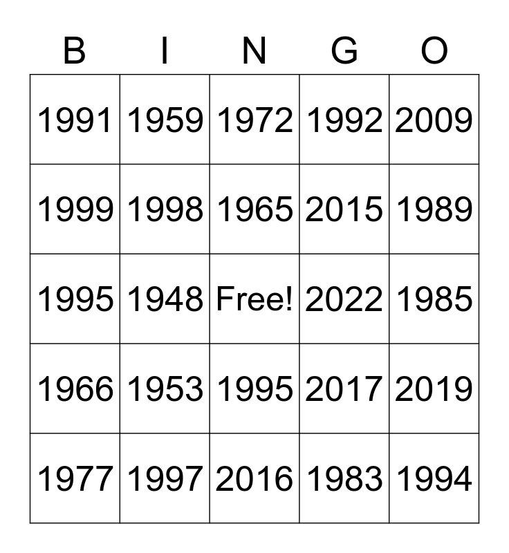 This bingo card has a free space and 81 words: 2012, 2013, 1972, 2018, 1957, 2002, 2012, 1978, 1992, 1967, 1996, 2012, 1992, 1991, 1951, 1999, 1994, 1953, 2021, 1985, 2002, 2009, 1995, 1965, 1998, 1993, 2002, 2020, 1977, 1975, 1989, 1950, 2016, 2009, 1977, 2022, 1996, 1953, 1979, 1960, 1994, 2017, 1981, 1980, 1948, 1982, 1959, 1958, 1953, 1997, 2017, 2019, 2014, 2012, 1997, 1965, 1962, 1966, 1973, 1976, 1995, 1989, 1959, 2008, 2009, 2006, 1962, 1983, 1989, 2008, 1972, 1966, 1997, 1967, 1978, 2022, 1980, 1983, 1999, 2015 and 1991.