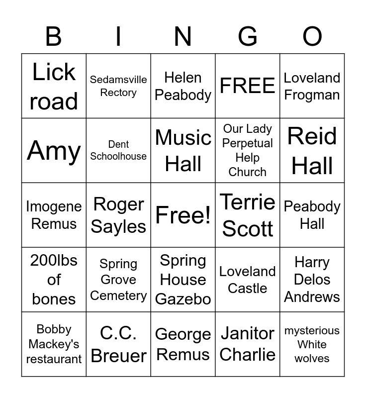 This bingo card has a free space and 24 words: Spring Grove Cemetery, C.C. Breuer, Music Hall, Bobby Mackey's restaurant, Loveland Frogman, Lick road, Amy, Sedamsville Rectory, Terrie Scott, Spring House Gazebo, Our Lady Perpetual Help Church, Imogene Remus, Loveland Castle, Harry Delos Andrews, Dent Schoolhouse, Janitor Charlie, Peabody Hall, Helen Peabody, Reid Hall, Roger Sayles, mysterious White wolves, 200lbs of bones, FREE and George Remus.