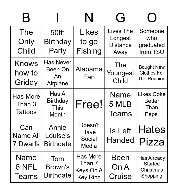 This bingo card has a free space and 24 words: Annie Louise's Birthdate, Tom Brown's Birthdate, Alabama Fan, Name 6 NFL Teams, Someone who graduated from TSU, The Only Child, Knows how to Griddy, 50th Birthday Party, Name 5 MLB Teams, Doesn't Have Social Media, The Youngest Child, Has More Than 3 Tattoos, Is Left Handed, Hates Pizza, Has Never Been On An Airplane, Been On A Cruise, Likes Coke Better Than Pepsi, Likes to go Fishing, Bought New Clothes For The Reunion, Has A Birthday This Month, Has Already Started Christmas Shopping, Can Name All 7 Dwarfs, Lives The Longest Distance Away and Has More Than 7 Keys On A Key Ring.