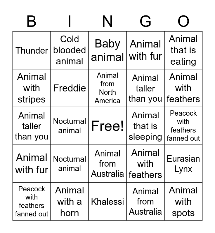 This bingo card has a free space and 55 words: Albino peacock, Peacock with feathers fanned out, Eurasian Lynx, Thunder, Khalessi, Holly, Freddie, Animal with stripes, Animal taller than you, Warm blooded animal, Animal with fur, Animal that lives in rainforest, Animal that swims, Cold blooded animal, Artic animal, African animal, Animal that is eating, Nocturnal animal, Animal with a horn, Animal with spots, Animal that is sleeping, Animal shorter than you, Animal with feathers, Baby animal, Animal from South America, Animal from North America, Animal from Australia, Albino Peacock, Peacock with feathers fanned out, Eurasian Lynx, Tundra, Kahlessi, Holly, Freddie, Animal with stripes, Animal taller than you, Warm blooded animal, Animal with fur, Animal that lives in the rainforest, Animal that swims, Cold blooded animal, Arctic animal, African animal, Animal that is eating, Nocturnal animal, Animal with a horn, Animal with spots, Animal that is sleeping, Animal shorter than you, Animal with feathers, Baby animals, Animal from South America, Animal from North America, Animal from Australia and Animal from Asia.