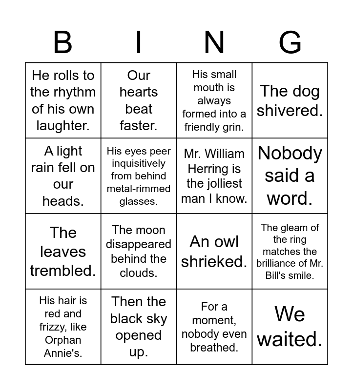 This bingo card has 18 words: The moon disappeared behind the clouds., We waited., His small mouth is always formed into a friendly grin., He rolls to the rhythm of his own laughter., An owl shrieked., The dog shivered., His hair is red and frizzy, like Orphan Annie's., Our hearts beat faster., Nobody said a word., The leaves trembled., For a moment, nobody even breathed., A light rain fell on our heads., The gleam of the ring matches the brilliance of Mr. Bill's smile., His eyes peer inquisitively from behind metal-rimmed glasses., Mr. William Herring is the jolliest man I know., His eyes glinted like black beetles, Then the black sky opened up. and An owl shrieked..