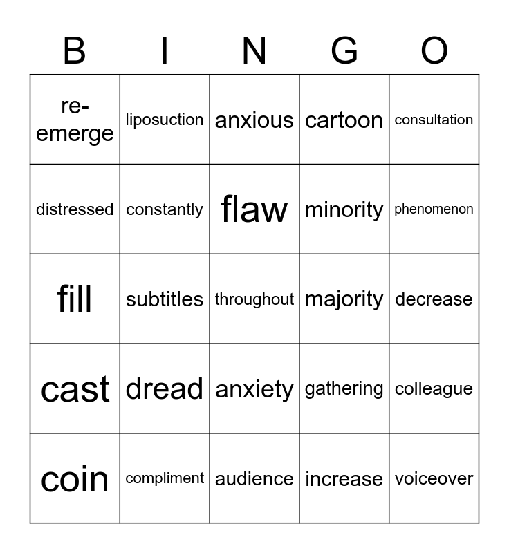 This bingo card has a free space and 24 words: dread, compliment, flaw, coin, consultation, re-emerge, distressed, liposuction, majority, anxiety, minority, fill, gathering, colleague, constantly, increase, decrease, anxious, phenomenon, subtitles, voiceover, cast, cartoon and audience.