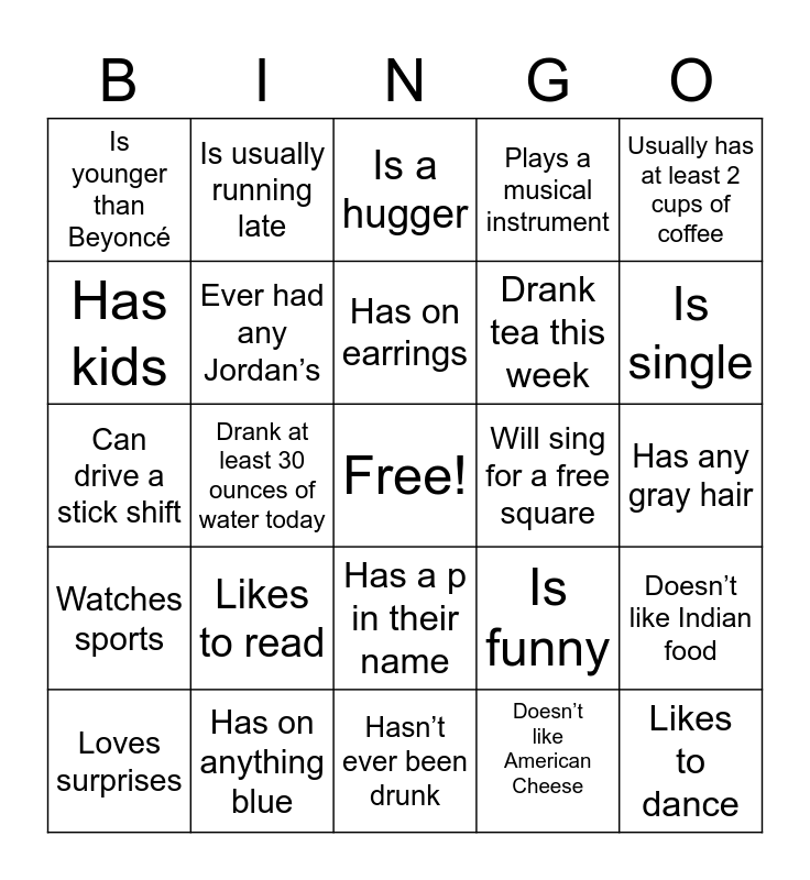 This bingo card has a free space and 44 words: Is afraid of clowns, Likes to dance, Is married, Loves surprises, Drinks a lot of water, Doesn’t like American Cheese, Is a hugger, Listened to a rap song today, Usually has at least 2 cups of coffee, Has on anything blue, Plays a musical instrument, Will sing for a free square, Has a p in their name, Likes to read, Has knitted something, Hasn’t ever been drunk, Is left handed, Can drive a stick shift, Is on social media, Is single, Is usually running late, Does not like surprises, Had a drink this week, Is younger than Beyoncé, Has brown eyes, Has any gray hair, Doesn’t eat bananas, Loves Vegetables, Is funny, Watches sports, Has a pet, Doesn’t like Indian food, Wears wigs, Is good at spelling, Drank at least 30 ounces of water today, Hates milk, Broke their leg before, Wears contacts, Has on earrings, Has kids, Drank tea this week, Cooked chicken this month, Ever had any Jordan’s and Can name 3 Kevin Hart movies.