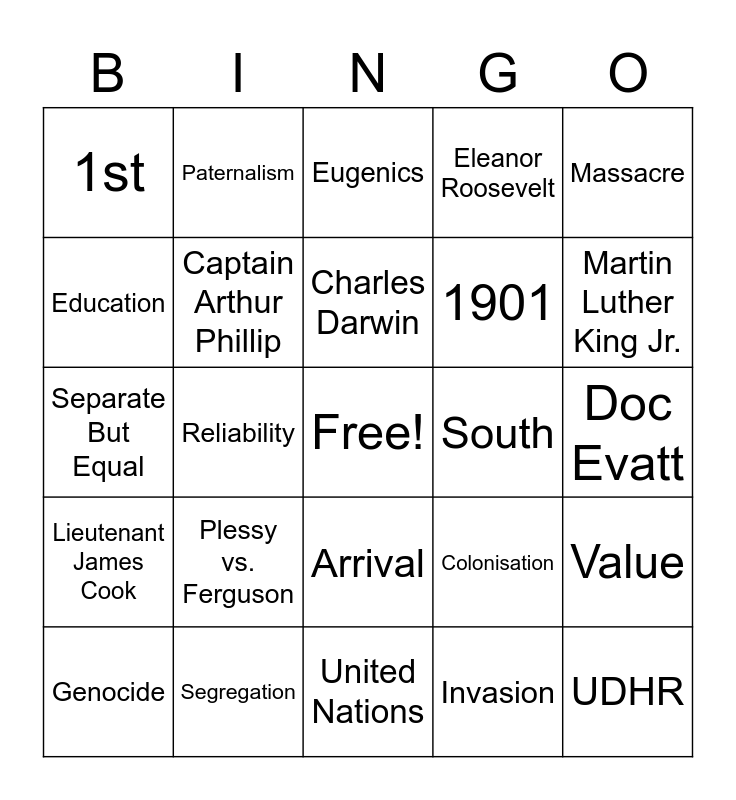 This bingo card has a free space and 34 words: Terra Nullius, Invasion, 1770, 1788, Lieutenant James Cook, Captain Arthur Phillip, Massacre, Genocide, Paternalism, Social Darwinism, Charles Darwin, Eugenics, Slavery, Lynching, South, Martin Luther King Jr., Segregation, Separate But Equal, Plessy vs. Ferguson, Colonisation, Arrival, 26th, 1st, Doc Evatt, United Nations, UDHR, Eleanor Roosevelt, Assimilation, 1901, Education, 13th, Reliability, Value and Limitation.