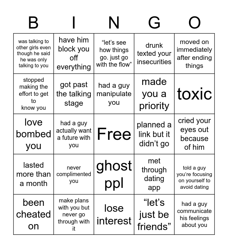 This bingo card has a free space and 24 words: never complimented you, make plans with you but never go through with it, had a guy manipulate you, been cheated on, moved on immediately after ending things, was talking to other girls even though he said he was only talking to you, stopped making the effort to get to know you, have him block you off everything, planned a link but it didn’t go, ghost ppl, made you a priority, love bombed you, met through dating app, told a guy you’re focusing on yourself to avoid dating, got past the talking stage, “let’s just be friends”, cried your eyes out because of him, “let’s see how things go. just go with the flow”, toxic, had a guy actually want a future with you, had a guy communicate his feelings about you, lasted more than a month, drunk texted your insecurities and lose interest.