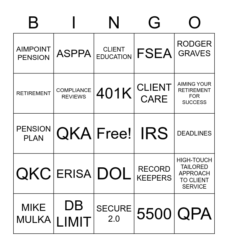 This bingo card has a free space and 24 words: ERISA, DB LIMIT, 401K, MIKE MULKA, RODGER GRAVES, AIMPOINT PENSION, RETIREMENT, ASPPA, IRS, DOL, CLIENT CARE, PENSION PLAN, RECORD KEEPERS, HIGH-TOUCH TAILORED APPROACH TO CLIENT SERVICE, COMPLIANCE REVIEWS, 5500, DEADLINES, CLIENT EDUCATION, AIMING YOUR RETIREMENT FOR SUCCESS, QKA, QPA, QKC, FSEA and SECURE 2.0.