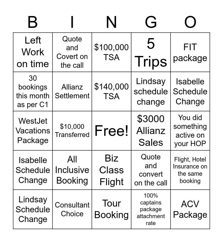 This bingo card has a free space and 24 words: All Inclusive Booking, Consultant Choice, $140,000 TSA, Lindsay Schedule Change, FIT package, Left Work on time, 30 bookings this month as per C1, Quote and Covert on the call, $3000 Allianz Sales, Biz Class Flight, Lindsay schedule change, WestJet Vacations Package, Quote and convert on the call, Flight, Hotel Insurance on the same booking, Allianz Settlement, 100% captains package attachment rate, You did something active on your HOP, $100,000 TSA, Isabelle Schedule Change, $10,000 Transferred, ACV Package, Isabelle Schedule Change, 5 Trips and Tour Booking.