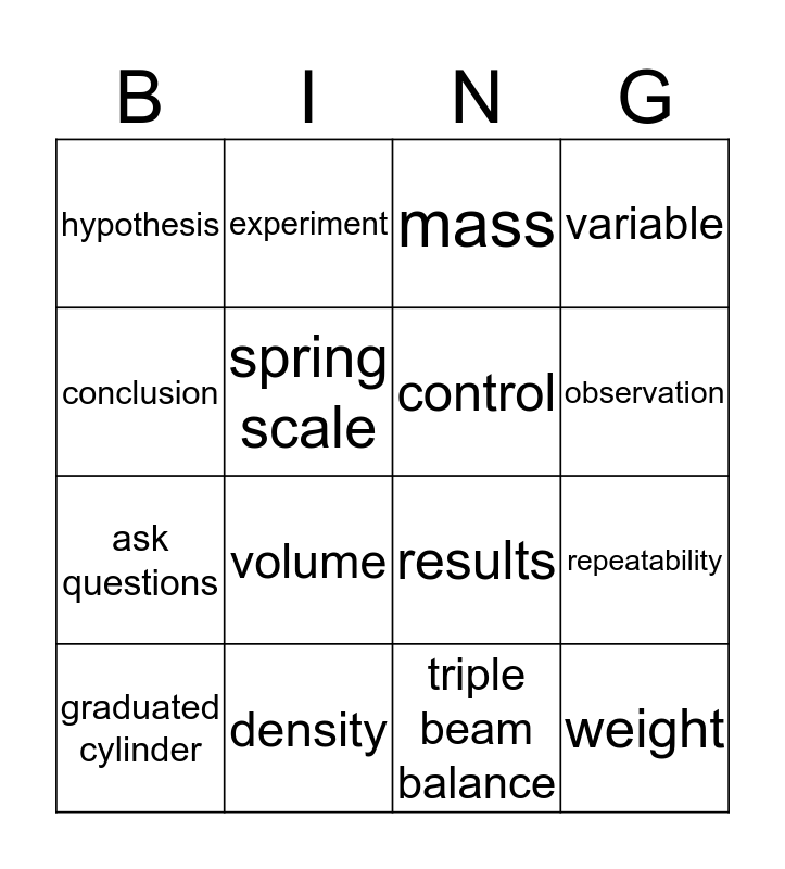 This bingo card has a free space and 15 words: graduated cylinder, weight, mass, hypothesis, observation, conclusion, volume, triple beam balance, spring scale, ask questions, repeatability, variable, control, experiment and density.