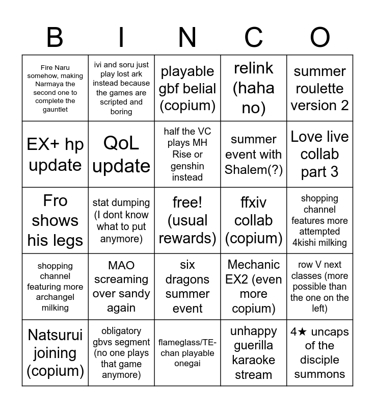 This bingo card has a free space and 24 words: MAO screaming over sandy again, obligatory gbvs segment (no one plays that game anymore), half the VC plays MH Rise or genshin instead, Natsurui joining (copium), summer roulette version 2, Fire Naru somehow, making Narmaya the second one to complete the gauntlet, EX+ hp update, ivi and soru just play lost ark instead because the games are scripted and boring, ffxiv collab (copium), six dragons summer event, summer event with Shalem(?), Fro shows his legs, Mechanic EX2 (even more copium), row V next classes (more possible than the one on the left), QoL update, unhappy guerilla karaoke stream, shopping channel features more attempted 4kishi milking, playable gbf belial (copium), Love live collab part 3, stat dumping (I dont know what to put anymore), 4★ uncaps of the disciple summons, shopping channel featuring more archangel milking, relink (haha no) and flameglass/TE-chan playable onegai.