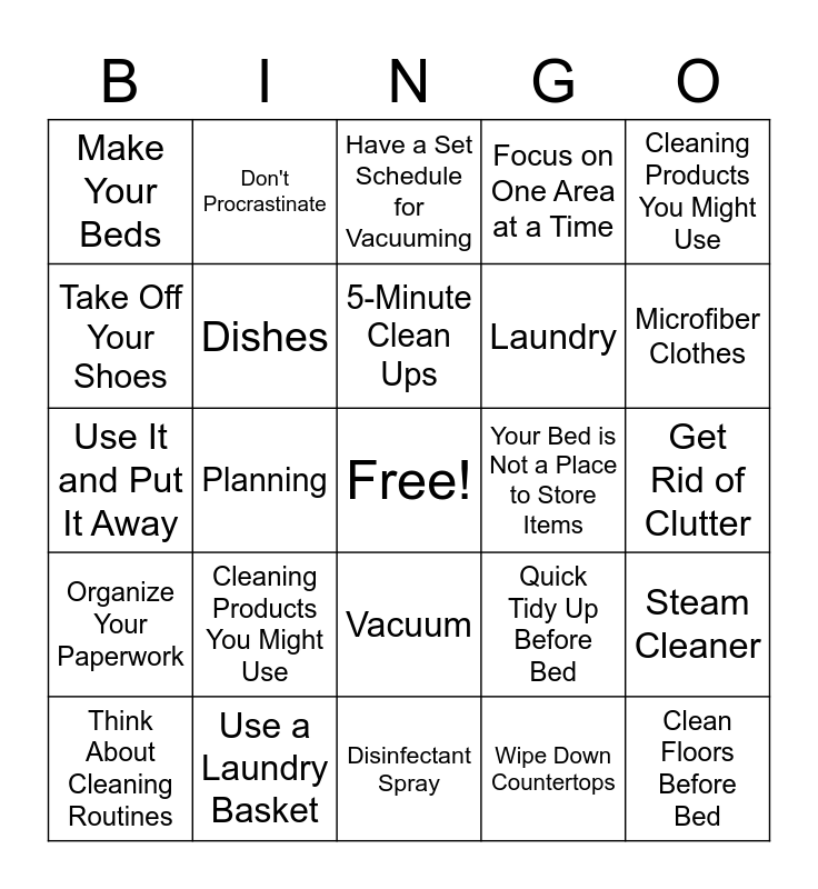 This bingo card has a free space and 24 words: Cleaning Products You Might Use, Use a Laundry Basket, 5-Minute Clean Ups, Think About Cleaning Routines, Cleaning Products You Might Use, Make Your Beds, Take Off Your Shoes, Don't Procrastinate, Your Bed is Not a Place to Store Items, Vacuum, Laundry, Use It and Put It Away, Quick Tidy Up Before Bed, Steam Cleaner, Dishes, Wipe Down Countertops, Get Rid of Clutter, Have a Set Schedule for Vacuuming, Microfiber Clothes, Planning, Clean Floors Before Bed, Organize Your Paperwork, Focus on One Area at a Time and Disinfectant Spray.