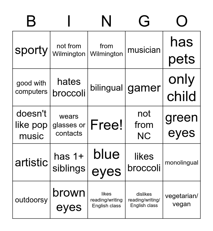 This bingo card has a free space and 24 words: has 1+ siblings, brown eyes, bilingual, outdoorsy, has pets, sporty, good with computers, not from Wilmington, not from NC, blue eyes, gamer, doesn't like pop music, likes broccoli, monolingual, hates broccoli, dislikes reading/writing/ English class, green eyes, from Wilmington, only child, wears glasses or contacts, vegetarian/ vegan, artistic, musician and likes reading/writing English class.