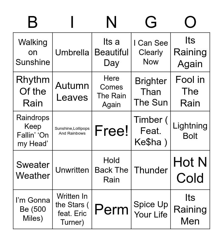 This bingo card has a free space and 68 words: Carolina in My Mind, Its Raining Men, Pocketful of Sunshine, Set Fire to the Rain, Ain't No Sunshine, Over The Rainbow, Umbrella, Cold, Here Comes The Rain Again, Temperature, Hold Back The Rain, Rock You Like A Hurricane, Lightning Bolt, Its Raining Again, Purple Rain, Rhythm Of the Rain, Sunshine,Lollipops And Rainbows, Walking on Sunshine, Sunflower, Unwritten, Brighter Than The Sun, Thunder, Sweater Weather, Hurricane, Burnin’ Up, Burn, Heat Waves, Stormy Weather, Hot N Cold, Thunderstruck, Its a Beautiful Day, Rain on Me ( with Ariana Grande), Rain Over Me ( ft Marc Anthony), Have You Ever Seen The Rain ?, I Can See Clearly Now, A Year Without Rain, White Lighting, I’m Gonna Be (500 Miles), Fool in The Rain, Raindrops Keep Fallin’ ‘On my Head’, Chasing The Sun, Mr.Brightside, Autumn Leaves, Don't Rain on My Parade, It Will Rain, TroubleMaker, Hot Stuff, Fire Burning, Timber ( Feat. Ke$ha ), Written In the Stars ( feat. Eric Turner), Circles, Airplanes, Jump Around, Perm, Runaway Baby, I Love A Rainy Night, Spice Up Your Life, Come on Over ( All I Want Is You), Voodoo, Maria Maria ( feat The Product G& B), I Feel The Earth Move, Do Wah Diddy Diddy, The Wind, Fire, Blown Away, CowBoy Casanova, Stuck Like Glue and Making A Fire.