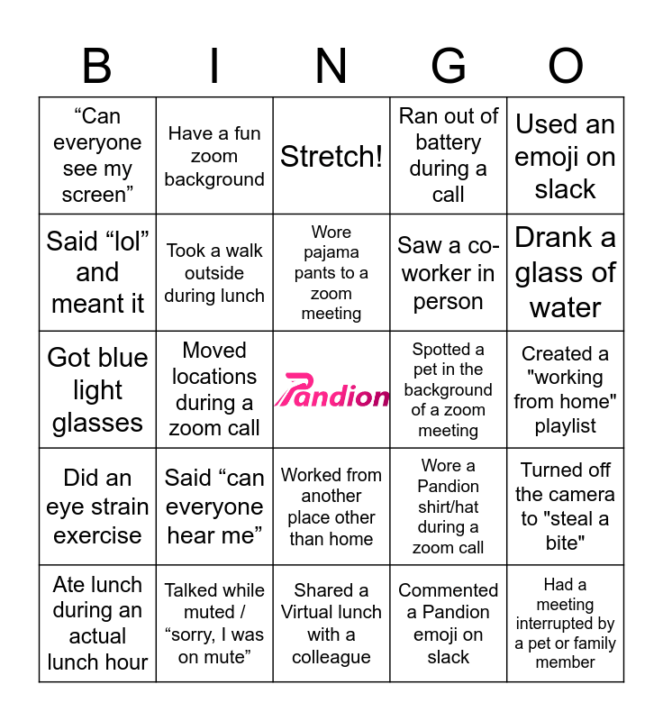 This bingo card has a free space and 24 words: Said “can everyone hear me”, Talked while muted / “sorry, I was on mute”, Wore pajama pants to a zoom meeting, Ate lunch during an actual lunch hour, Used an emoji on slack, “Can everyone see my screen”, Said “lol” and meant it, Have a fun zoom background, Spotted a pet in the background of a zoom meeting, Worked from another place other than home, Saw a co-worker in person, Got blue light glasses, Wore a Pandion shirt/hat during a zoom call, Turned off the camera to "steal a bite", Took a walk outside during lunch, Commented a Pandion emoji on slack, Created a "working from home" playlist, Stretch!, Drank a glass of water, Moved locations during a zoom call, Had a meeting interrupted by a pet or family member, Did an eye strain exercise, Ran out of battery during a call and Shared a Virtual lunch with a colleague.
