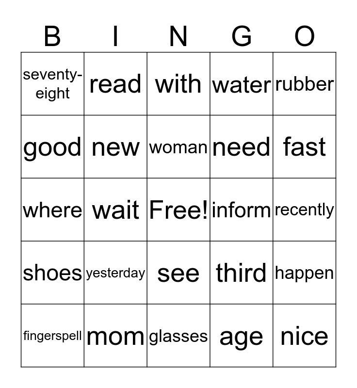 This bingo card has a free space and 24 words: yesterday, mom, woman, fingerspell, rubber, seventy- eight, good, read, inform, see, need, where, third, happen, new, age, recently, with, fast, wait, nice, shoes, water and glasses.