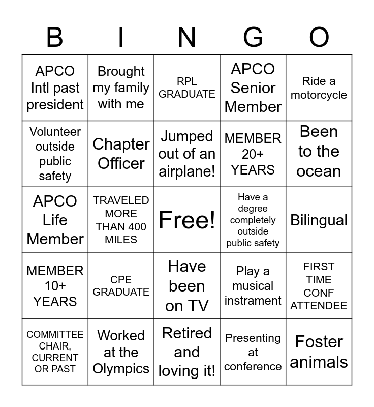 This bingo card has a free space and 24 words: CPE GRADUATE, Worked at the Olympics, Jumped out of an airplane!, COMMITTEE CHAIR, CURRENT OR PAST, Ride a motorcycle, APCO Intl past president, Volunteer outside public safety, Brought my family with me, Have a degree completely outside public safety, Have been on TV, MEMBER 20+ YEARS, APCO Life Member, Play a musical instrament, FIRST TIME CONF ATTENDEE, Chapter Officer, Presenting at conference, Bilingual, RPL GRADUATE, Been to the ocean, TRAVELED MORE THAN 400 MILES, Foster animals, MEMBER 10+ YEARS, APCO Senior Member and Retired and loving it!.