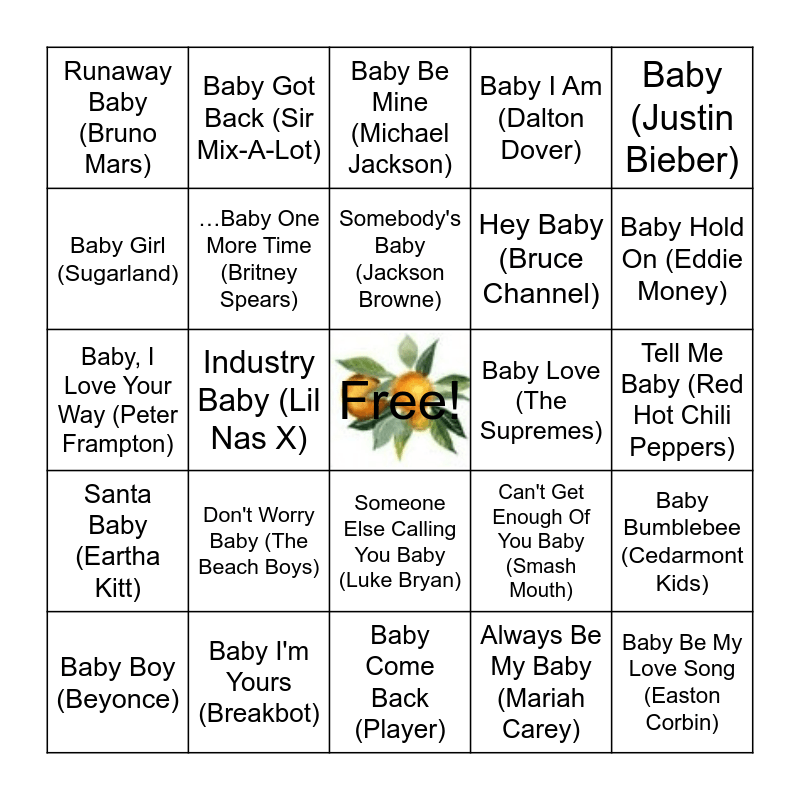 This bingo card has a free space and 34 words: Be My Baby (The Ronettes), Always Be My Baby (Mariah Carey), Come On Over Baby (Christina Agulera), Ice Ice Baby (Vanilla Ice), Santa Baby (Eartha Kitt), …Baby One More Time (Britney Spears), Baby (Justin Bieber), Baby Boy (Beyonce), Baby Got Back (Sir Mix-A-Lot), Baby It's Cold Outside (Michael Buble), Somebody's Baby (Jackson Browne), Baby Be Mine (Michael Jackson), Give It To Me Baby (Rick James), Hey Baby (Pitbull), Baby Love (The Supremes), Baby Hold On (Eddie Money), Baby I'm Yours (Breakbot), Baby, I Love Your Way (Peter Frampton), Don't Worry Baby (The Beach Boys), Can't Get Enough Of You Baby (Smash Mouth), Someone Else Calling You Baby (Luke Bryan), Baby Shark (Pinkfong), Runaway Baby (Bruno Mars), Tell Me Baby (Red Hot Chili Peppers), Baby Come Back (Player), Baby Be My Love Song (Easton Corbin), Baby I Am (Dalton Dover), Hey Baby (No Doubt), Hey Baby (Bruce Channel), Baby Girl (Sugarland), When She Says Baby (Jason Aldean), Industry Baby (Lil Nas X), Baby Bumblebee (Cedarmont Kids) and Bust It Baby (Piles).