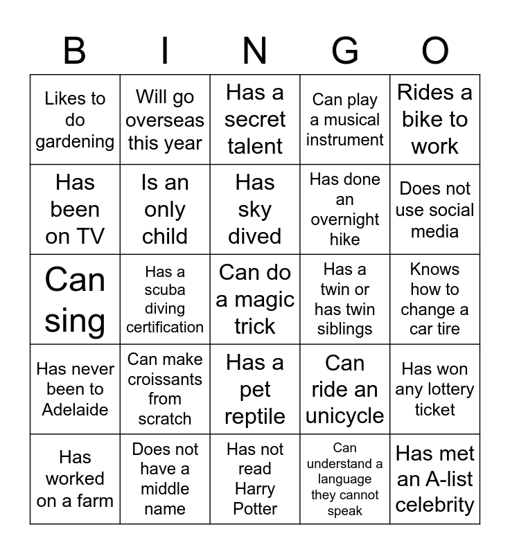 This bingo card has a free space and 24 words: Can make croissants from scratch, Does not have a middle name, Has sky dived, Has worked on a farm, Rides a bike to work, Likes to do gardening, Has been on TV, Will go overseas this year, Has a twin or has twin siblings, Has a pet reptile, Has done an overnight hike, Can sing, Can ride an unicycle, Has won any lottery ticket, Is an only child, Can understand a language they cannot speak, Knows how to change a car tire, Has a secret talent, Does not use social media, Has a scuba diving certification, Has met an A-list celebrity, Has never been to Adelaide, Can play a musical instrument and Has not read Harry Potter.