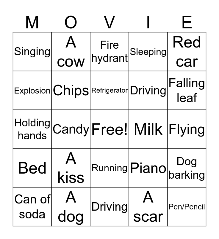 This bingo card has a free space and 24 words: A kiss, A dog, Refrigerator, Can of soda, Red car, Singing, Explosion, A cow, Milk, Running, Driving, Holding hands, Piano, Dog barking, Chips, A scar, Flying, Fire hydrant, Falling leaf, Candy, Pen/Pencil, Bed, Sleeping and Driving.