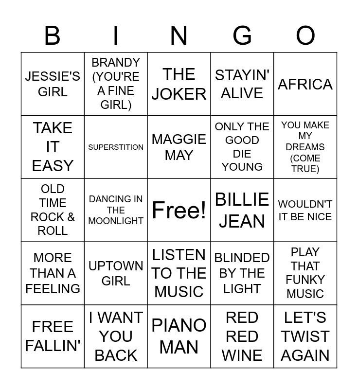 This bingo card has a free space and 47 words: WALKING TO NEW ORLEANS, LET'S TWIST AGAIN, REBEL ROUSER, PIANO MAN, UPTOWN GIRL, RICH GIRL, BRANDY (YOU'RE A FINE GIRL), SWEET HOME ALABAMA, TAKE IT EASY, BAD MOON RISING, SUPERSTITION, STAYIN' ALIVE, PLAY THAT FUNKY MUSIC, BLINDED BY THE LIGHT, BAD BAD LEROY BROWN, GOOD VIBRATIONS, MAGGIE MAY, BILLIE JEAN, COME ON EILEEN, AFRICA, DANCING IN THE MOONLIGHT, RED RED WINE, JESSIE'S GIRL, ONLY THE GOOD DIE YOUNG, AMERICAN PIE, YOU MAKE MY DREAMS (COME TRUE), FREE FALLIN', FAT BOTTOMED GIRLS, LISTEN TO THE MUSIC, MORE THAN A FEELING, JACK & DIANE, ROCKET MAN, MR. BLUE SKY, DECEMBER 1963 (OH WHAT A NIGHT), ESCAPE (THE PINA COLADA SONG), I WANT YOU BACK, WOULDN'T IT BE NICE, UNDER PRESSURE, IT'S STILL ROCK & ROLL TO ME, CROCODILE ROCK, DON'T STOP BELIEVIN', THE JOKER, OLD TIME ROCK & ROLL, WHAT I LIKE ABOUT YOU, LOVE SHACK, TAKIN' CARE OF BUSINESS and LOLA.