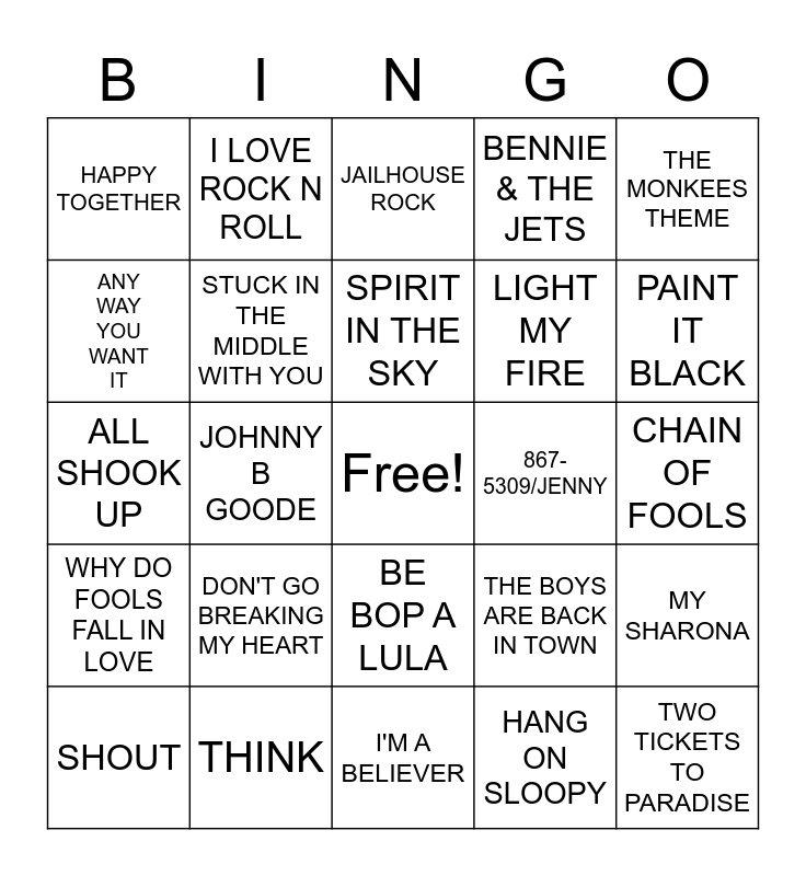 This bingo card has a free space and 47 words: HURTS SO GOOD, TWO TICKETS TO PARADISE, `BANG ON THE DRUM ALL DAY, I'M A BELIEVER, DON'T GO BREAKING MY HEART, I WANT YOU TO WANT ME, I LOVE ROCK N ROLL, CENTERFOLD, ANY WAY YOU WANT IT, MARGARITAVILL, STUCK IN THE MIDDLE WITH YOU, BENNIE & THE JETS, MY SHARONA, THE BOYS ARE BACK IN TOWN, I'M GONNA BE (5OO MILES), WE BUILT THIS CITY, SPIRIT IN THE SKY, 867-5309/JENNY, MY GUY, THE MONKEES THEME, JOHNNY B GOODE, HANG ON SLOOPY, HAPPY TOGETHER, LIGHT MY FIRE, FOR ONCE IN MY LIFE, PAINT IT BLACK, SHOUT, AIN'T THAT A SHAME, BE BOP A LULA, WHY DO FOOLS FALL IN LOVE, A TEENAGER IN LOVE, I WONDER WHY, TAKE GOOD CARE OF MY BABY, LAST TRAIN TO CLARKSVILLE, WALK LIKE A MAN, THINK, CHAIN OF FOOLS, CECELIA, MAGIC CARPET RIDE, WONDERFUL WORLD, THAT'LL BE THE DAY, JAILHOUSE ROCK, ALL SHOOK UP, IN THE MIDNIGHT HOUR, ROCKY TOP, THANK GOD I'M A COUNTRY BOY and THE BALLAD OF DAVY CROCKETT.