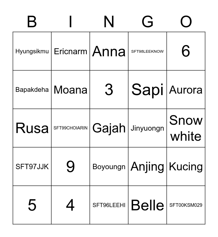 This bingo card has a free space and 24 words: 9, 4, 3, 5, 6, Hyungsikmu, Bapakdeha, Ericnarm, Jinyuongn, Boyoungn, Sapi, Rusa, Anjing, Kucing, Moana, Belle, Snow white, Anna, Aurora, SFT99CHOIARIN, SFT00KSM029, SFT97JJK, SFT98LEEKNOW and SFT96LEEHI.
