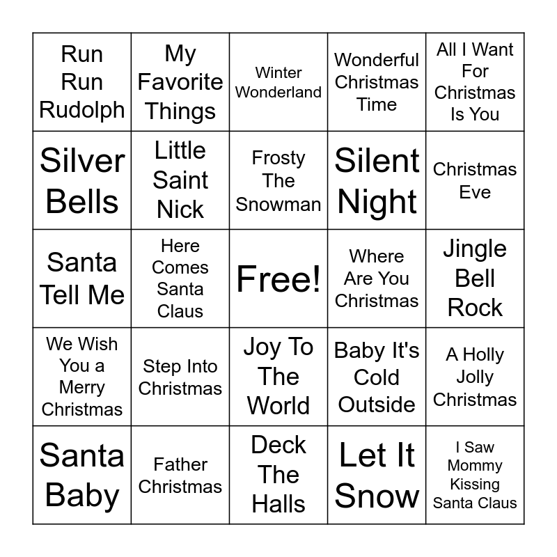 This bingo card has a free space and 24 words: Step Into Christmas, Father Christmas, Frosty The Snowman, Santa Baby, All I Want For Christmas Is You, Run Run Rudolph, Silver Bells, My Favorite Things, Where Are You Christmas, Joy To The World, Silent Night, Santa Tell Me, Baby It's Cold Outside, A Holly Jolly Christmas, Little Saint Nick, Let It Snow, Jingle Bell Rock, Winter Wonderland, Christmas Eve, Here Comes Santa Claus, I Saw Mommy Kissing Santa Claus, We Wish You a Merry Christmas, Wonderful Christmas Time and Deck The Halls.