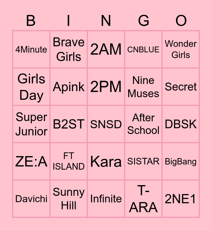 This bingo card has a free space and 24 words: Davichi, FT ISLAND, 2PM, T-ARA, Wonder Girls, 4Minute, Brave Girls, 2AM, After School, DBSK, Super Junior, Apink, SISTAR, BigBang, Girls Day, Sunny Hill, Infinite, CNBLUE, Secret, ZE:A, B2ST, Kara, Nine Muses and 2NE1.