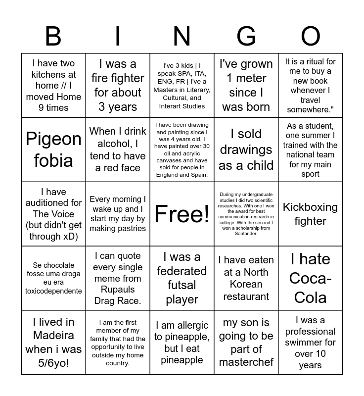 This bingo card has a free space and 49 words: My eyes are brown, I was a professional swimmer for over 10 years, I did a 68 metre free fall jump, I am allergic to pineapple, but I eat pineapple, I can quote every single meme from Rupauls Drag Race., I once went for a night out, got drunk and woke up in a different country, I was a fire fighter for about 3 years, I changed my hair color more than 5 times already, Pigeon fobia, I have a mild fear of birds, When I drink alcohol, I tend to have a red face, I've grown 1 meter since I was born, I hate Coca-Cola, I have eaten at a North Korean restaurant, I have horseback rided in Mongolia for 3 days, I have done couch surfing in Morocco, I have been drawing and painting since I was 4 years old. I have painted over 30 oil and acrylic canvases and have sold for people in England and Spain., During my undergraduate studies I did two scientific researches. With one I won the award for best communication research in college. With the second I won a scholarship from Santander., 7 is my favorite number and whenever I have to choose numbers, increase TV or radio volume, travel days, etc. I try to choose multiples of 7 preferably., It is a ritual for me to buy a new book whenever I travel somewhere.", Every morning I wake up and I start my day by making pastries, my son is going to be part of masterchef, I have two kitchens at home // I moved Home 9 times, I sold drawings as a child, I've eaten crickets, jellyfish, and snake and enjoyed them all, As a student, one summer I trained with the national team for my main sport, I lived in Madeira when i was 5/6yo!, I have a condition called syndactyly which causes fused or webbed fingers., I was a federated futsal player, Se chocolate fosse uma droga eu era toxicodependente, I'm team milk before cereal, I almost started my own bibs company called Cuddles, I have 2 passports, both from different countries. Neither are Portuguese., consigo mexer a orelha, I am the first member of my family that had the opportunity to live outside my home country., I ate a poisonous apple on my honeymoon. Almost die!! :), I use contact lenses and can't see (almost) anything without them., I was surprised to be invited for this event., Kickboxing fighter, Tenho dupla nacionalidade, I was born with one leg longer than the other, One day I would like to learn how to play drums, If I had to switch professions, I'd be a politician., I have a healthy obsession with alchemy. ", I have auditioned for The Voice (but didn't get through xD), I've 3 kids | I speak SPA, ITA, ENG, FR | I've a Masters in Literary, Cultural, and Interart Studies, I trained a female volleyball team for 4 years. | I’m really really obsessed about avoiding odd numbers. In my mind odd numbers represent imperfection. If I set the TV volume it must be set to an even volume level, if I run it must be an even num, Sou Brasileira, nasci no rio de janeiro e nem gosto muito de carnaval | enjoo a ler ou a escrever no carro | Sou mega distraída e indecisa | Já fui parar a esquadra no carro da polícia | já fui federada de basketball | Não gosto de animais de est and O mais longe que já estive do mar foram 4 meses porque estive a viver em Kiev | Gostava de dar o nome de Teófilo aos meus filhos.