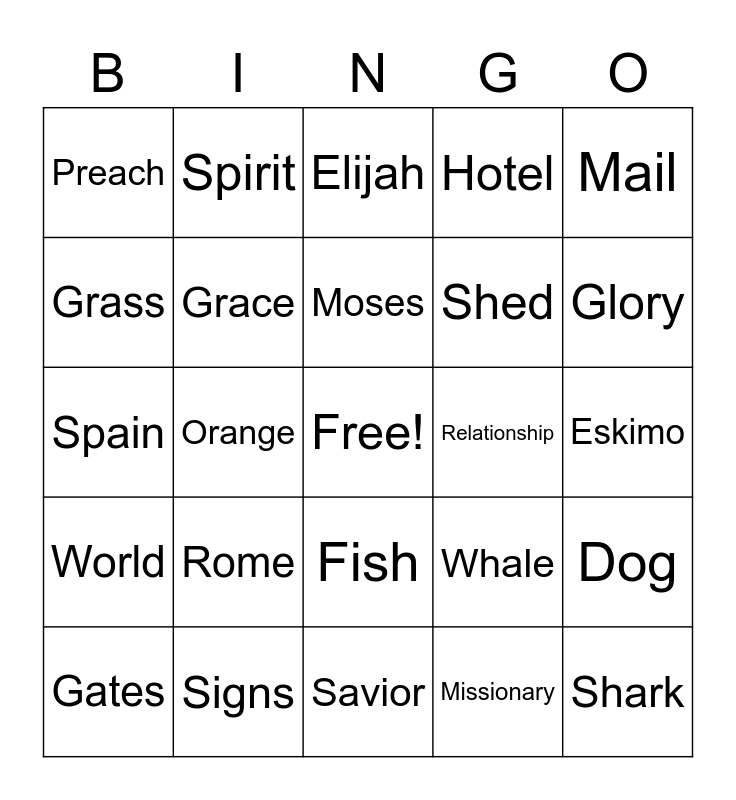 This bingo card has a free space and 34 words: Bulldozer, Missionary, Church, Hope, World, Grace, Mail, Gates, Spirit, Household, Moses, Elijah, Offering, Gentiles, Relationship, Glory, Signs, Spain, Rome, Whale, Fish, Foundation, Preach, Eskimo, Savior, Shark, Hotel, Banana, Shed, Grass, Napkin, Orange, Dog and Sun.