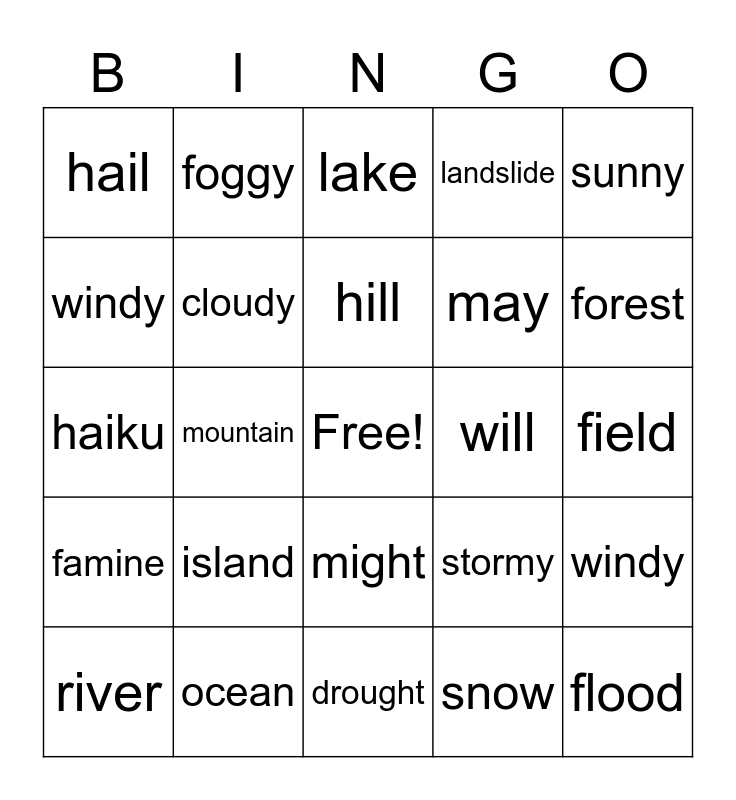 This bingo card has a free space and 24 words: island, ocean, hill, river, sunny, hail, windy, foggy, will, might, may, haiku, stormy, windy, cloudy, snow, field, lake, forest, mountain, flood, famine, landslide and drought.