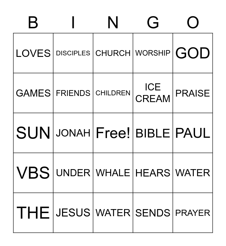 This bingo card has a free space and 24 words: UNDER, JESUS, CHILDREN, THE, GOD, LOVES, GAMES, DISCIPLES, BIBLE, WHALE, ICE CREAM, SUN, HEARS, WATER, FRIENDS, SENDS, PAUL, CHURCH, PRAISE, JONAH, PRAYER, VBS, WORSHIP and WATER.