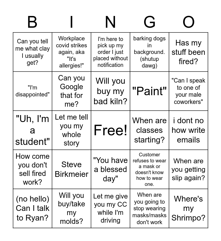 This bingo card has a free space and 24 words: Steve Birkmeier, Will you buy/take my molds?, Will you buy my bad kiln?, (no hello) Can I talk to Ryan?, Has my stuff been fired?, Can you tell me what clay I usually get?, "I'm disappointed", Workplace covid strikes again, aka "It's allergies!", When are classes starting?, "You have a blessed day", "Paint", "Uh, I'm a student", Customer refuses to wear a mask or doesn't know how to wear one., When are you getting slip again?, Can you Google that for me?, When are you going to stop wearing masks/masks don't work, i dont no how write emails, I'm here to pick up my order I just placed without notification, "Can I speak to one of your male coworkers", Let me tell you my whole story, Where's my Shrimpo?, How come you don't sell fired work?, barking dogs in background. (shutup dawg) and Let me give you my CC while I'm driving.