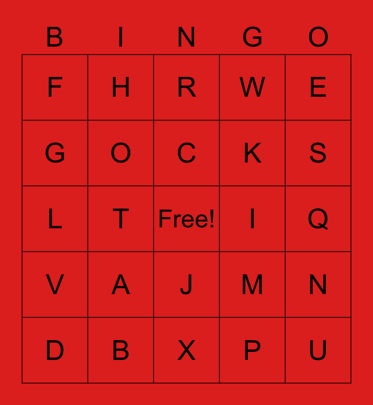 This bingo card has a free space and 24 words: A, B, C, D, E, F, G, H, I, J, K, L, M, N, O, P, Q, R, S, T, U, V, W and X.