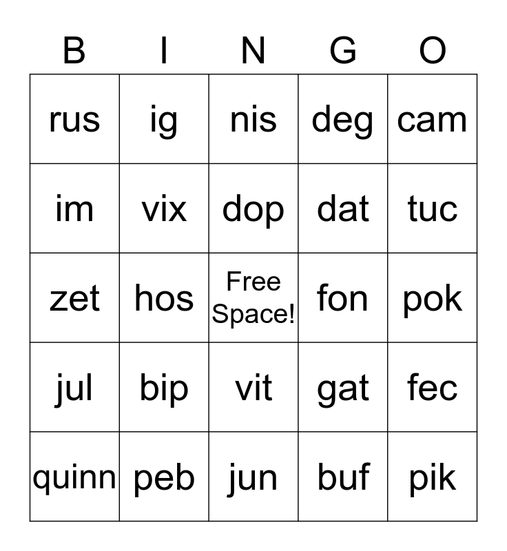 This bingo card has a free space and 24 words: bip, peb, dop, quinn, cam, rus, im, ig, fon, vit, dat, zet, gat, fec, vix, buf, pok, nis, tuc, hos, pik, jul, deg and jun.