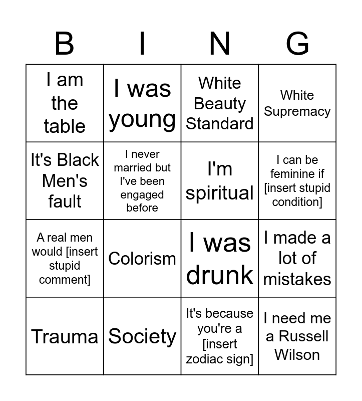 This bingo card has 16 words: Trauma, Society, White Beauty Standard, White Supremacy, It's Black Men's fault, I was young, I was drunk, I made a lot of mistakes, I am the table, I never married but I've been engaged before, It's because you're a [insert zodiac sign], I can be feminine if [insert stupid condition], A real men would [insert stupid comment], Colorism, I'm spiritual and I need me a Russell Wilson.