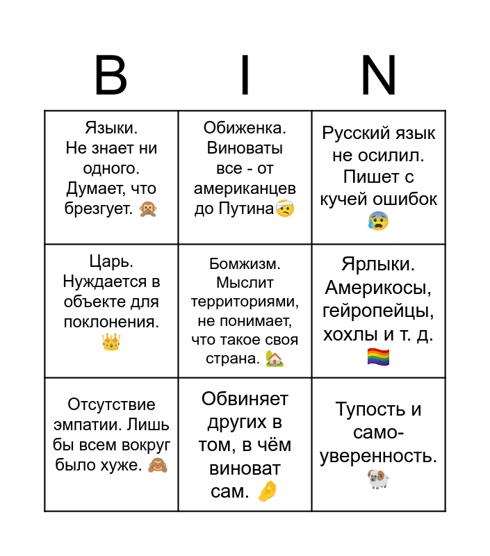 This bingo card has a free space and 8 words: Ярлыки. Америкосы, гейропейцы, хохлы и т. д.🏳️🌈, Русский язык не осилил. Пишет с кучей ошибок 😰, Обиженка. Виноваты все - от американцев до Путина🤕, Отсутствие эмпатии. Лишь бы всем вокруг было хуже. 🙈, Языки. Не знает ни одного. Думает, что брезгует. 🙊, Тупость и само-уверенность. 🐏, Царь. Нуждается в объекте для поклонения. 👑 and Обвиняет других в том, в чём виноват сам. 🤌.