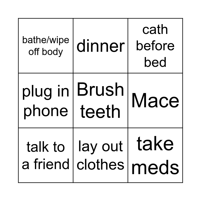 This bingo card has a free space and 8 words: Mace, cath before bed, dinner, talk to a friend, bathe/wipe off body, take meds, plug in phone and lay out clothes.